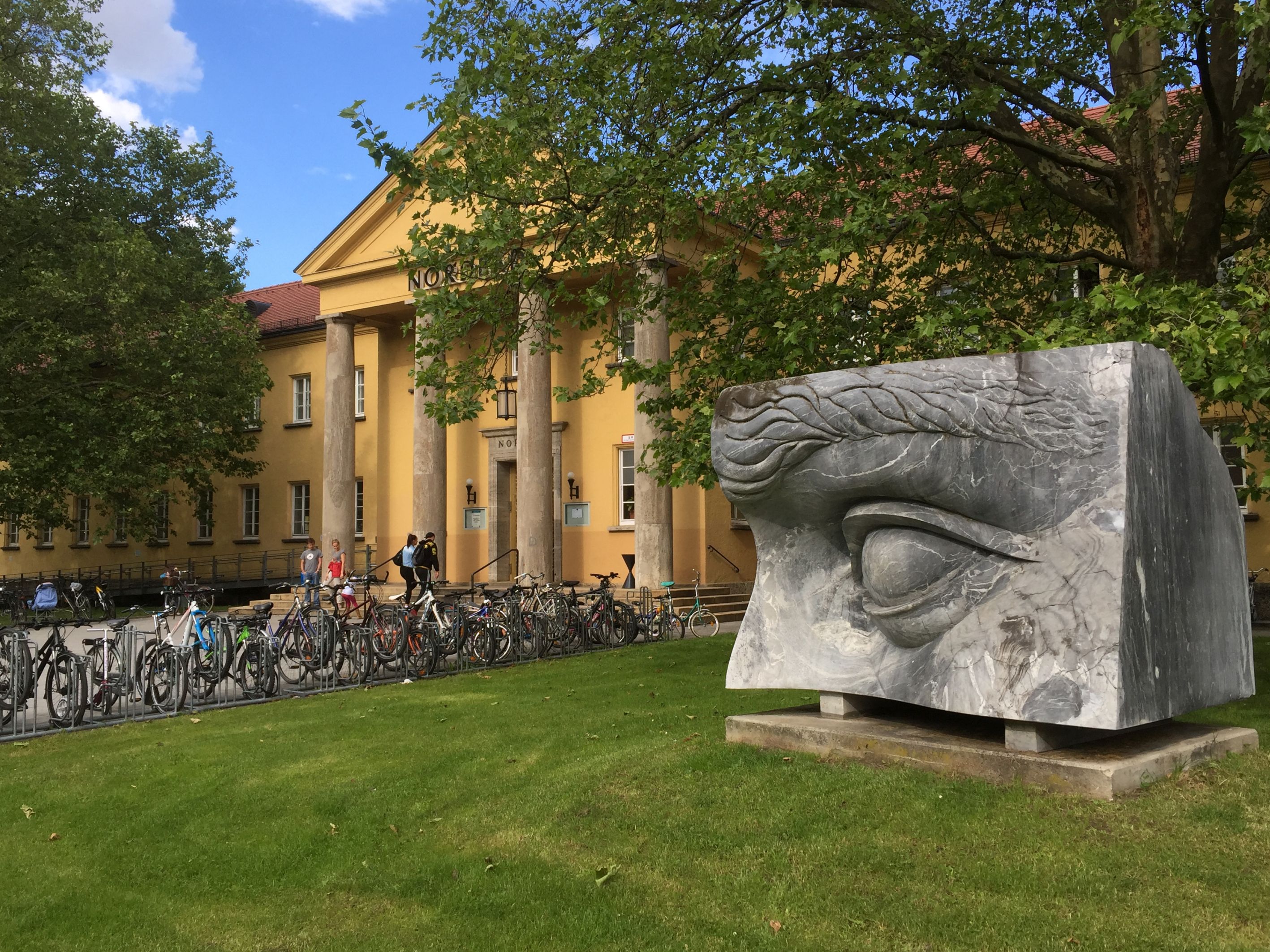 wacht über die ins Münchner Nordbad eilenden Badegäste (und ihre Fahrräder). Oder blickt er streng auf den Fotographen? (18. Juni 2016) - Näheres